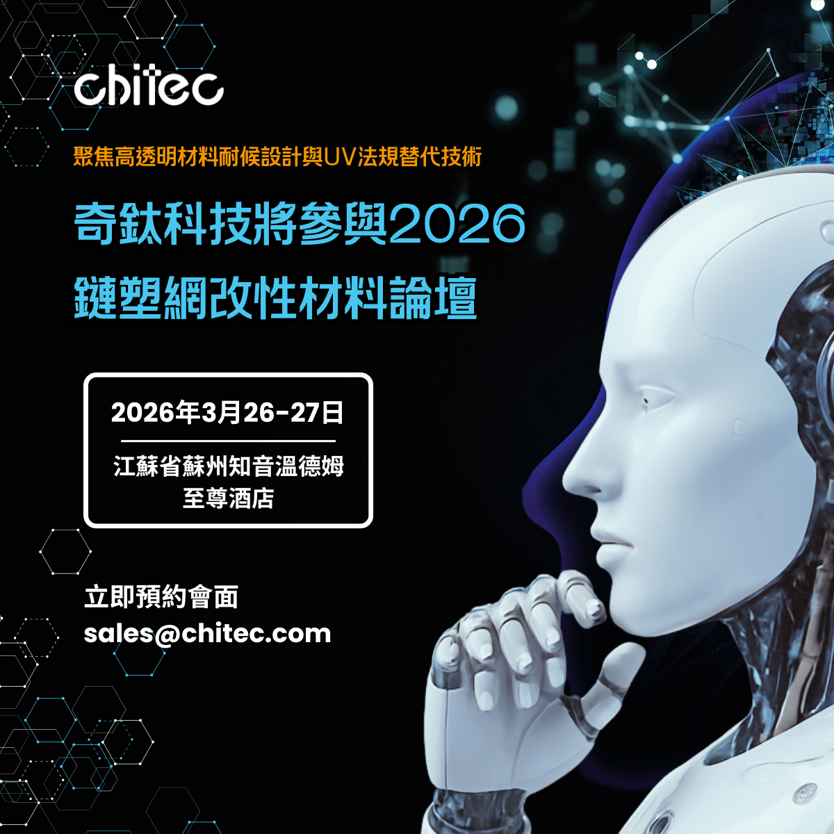 针对 SVHC UV-326 替代趋势,奇钛亦将在现场分享可延续既有配方架构的替代设计思路,协助客户在控制法规风险的同时维持材料性能稳定。此外,在光学级 PET 与食品接触应用领域,奇钛将说明 低迁移、低雾度 UV 解决方案 如何在加工温度、吸收效率与长期外观稳定性之间取得平衡,为透明材料建立更具可持续性的技术路径。